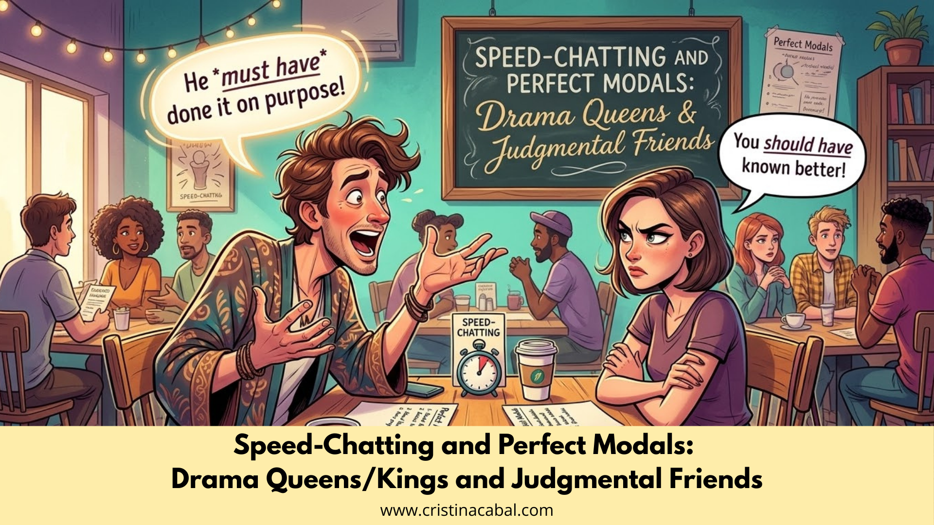 OK, vale… now we’re getting to the fun part! We already nailed the grammar, so it’s time to put it to work in an activity that always gets my students laughing, thinking, and stretching their English muscles. And the goal? Guessing a brand-new situation using clues built with our three magic structures.