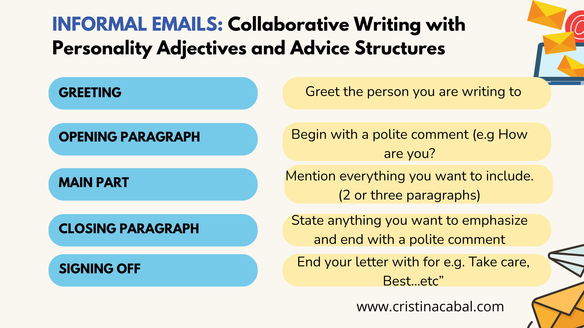 Students will write an informal email in groups of 3, giving advice about the person’s personality and whether the situation is a good idea, using
