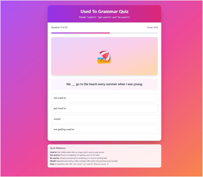 Prompt: Create an interactive quiz focusing on the grammar of used to, would (to indicate past) , get used to and be used to. Make 20 sentences. Give 4 optional answers only one of them correct. Add emojis to make the quiz more beautiful.