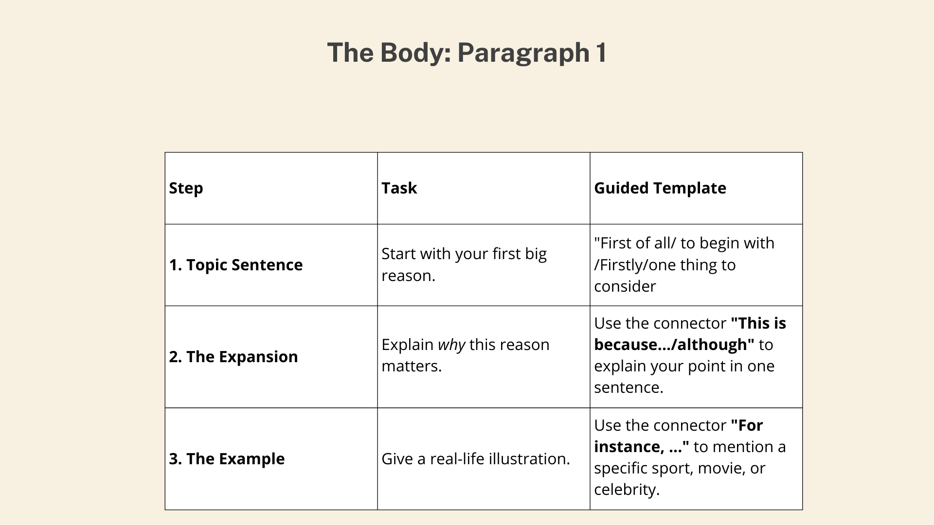 Now that they’ve clearly decided their position, it’s time to brainstorm ideas. I give them one simple task: write three ideas that support your opinion about the statement. These ideas will later become the body paragraphs. We won’t necessarily use all three, but thinking of an extra one gives them options and makes them feel more secure.