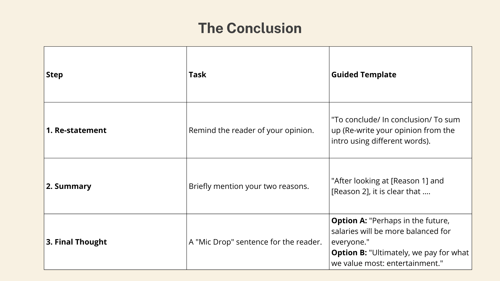 Once they have decided whether they agree or disagree, we zoom in on one specific skill: the introduction. Not a full essay. Not paragraphs and paragraphs. Just the opening. To make it manageable, I introduce the 3-Sentence Formula. Simple, structured, and very student-friendly.