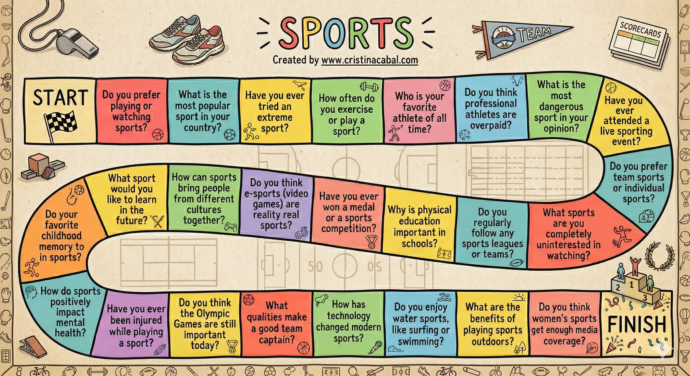 Create a printable board game with a winding path of [20] squares. (Board game race style) in English about Sports. Each of the squares will contain one of the questions generated above. Scrupulously respect the spelling of the questions without changing any letters. The questions cannot be repeated in the game. Include a ‘Start’ square at the beginning and a ‘Finish’ square at the end. All squares are connected to each other in sequence. The squares are not numbered. Colorful design. Put each of these questions in a square and respect the spelling without changing any letters. Title it ‘SPORTS’ and under the title ‘Created by www.cristinacabal.com‘. Everything must be in English. [Hand-drawn sketch] style.”