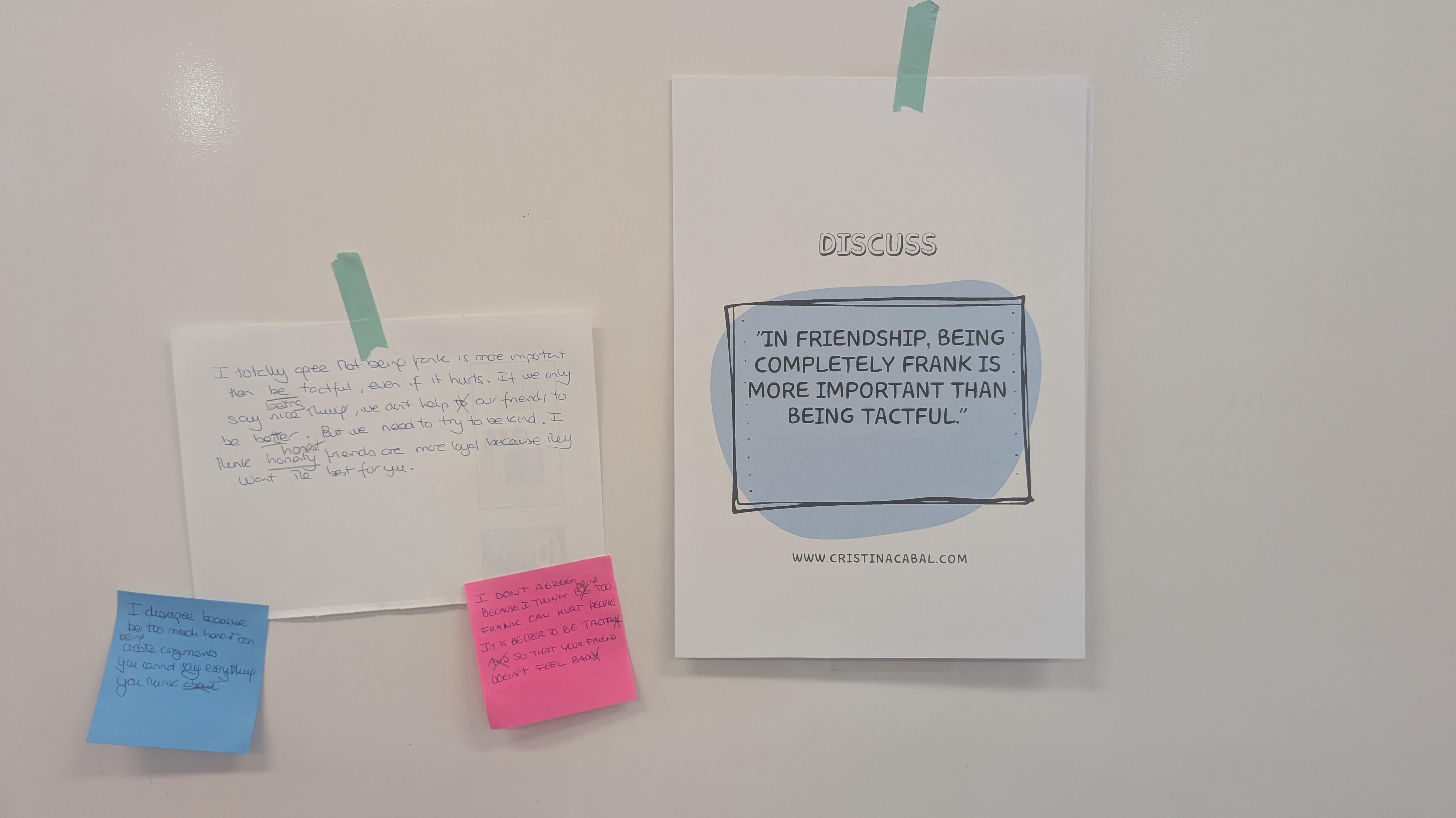 Round 3: Writing. React and respond. Students go around again, this time reading their classmates’ post-its. Then, they add a response—agreeing or disagreeing with their peer’s opinion, explaining why. Note: a couple of sentences would be enough this time.